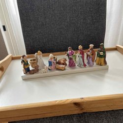 Allt är i mycket fint skick och perfekt som juldekoration för bord, hylla eller fönster. Passar både som barnvänlig krubba och som stilfull dekoration för vuxna.