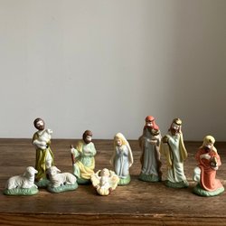 8 figurer till julkrubba. Några av de mindre figurerna har märken och skav, en har lösa del, se bil.