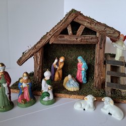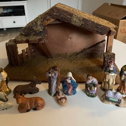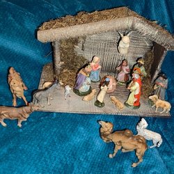 Julkrubba med tillhörande figurer. Inkluderar stall, brunn och diverse karaktärer och djur.