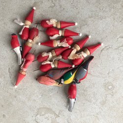 Danska tomtar i plast från Karen Kjærsgaard – fem stycken i fint skick. Allt är ju lite extra fint i Danmark, eller hur? Jag har samlat på de här i flera år och brukar sälja av några varje jul; nu får den här lilla truppen flytta vidare. De är små och lätta att pynta med på hyllan, i fönstret eller bland hyacinterna – och dessutom inte ömtåliga, så julfixet går snabbt och utan krångel. Jag packar ordentligt och skickar spårbart, och samfraktar gärna med annat du hittar i mina annonser.