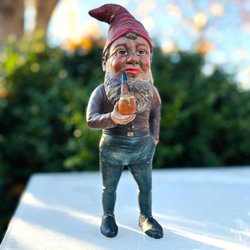 En charmig äldre tomte i keramik. Tomten har en röd luva, grön skjorta och röda byxor. Han håller en pipa i munnen och en räfsa över axeln. Perfekt för jul hemmet. Lite nött i färgen enligt bilder.