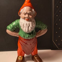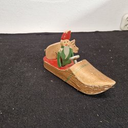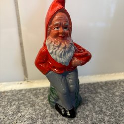 En äldre tomte figur i keramik. Han har en såg i händerna. 16 cm hög. Felfri