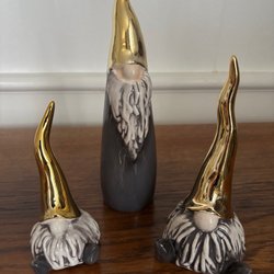 Två tomtar från Cult Design. En vit tomte med röd luva och en grå tomte med svart luva. Etikett finns kvar på den gråa tomten. Mäter ca 30 cm. Fint skick!