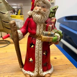 Tomte som även går att ha som lykta. Milda fina färger i grå-blått, vitt och silver