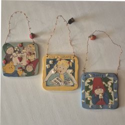 Tomtemor bär en röd väst, vit blus och en kjol med svarta, röda och gröna detaljer. Tomtefar har en prickig tröja, svarta byxor och röda strumpor. Båda dockorna har röda tomteluvor och vitt hår.