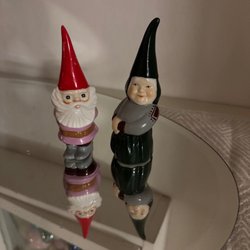 En söt äldre figur föreställande en tomte som sitter på en gris. Perfekt som juldekoration eller samlarobjekt.