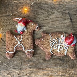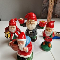 Två jul tomtar i keramik. En tomte håller en julgran och en annan håller en kvast. Perfekt för juldekoration.