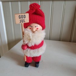 En charmig äldre jultomtefigur i keramik. Tomten sitter med en liten korg. På baksidan står det "God Jul" och "Made in Japan". 10 cm hög. Skick se bilder Samfraktar