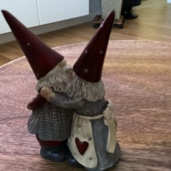 Ett charmigt tomtepar, perfekt för juldekorationer. Den ena tomten bär en korg med äpplen och den andra har en säck på ryggen.
