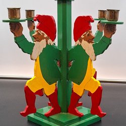 En dekorativ trädgårdstomte som håller två ljusstakar formade som ölfat. Perfekt för att skapa en mysig atmosfär.