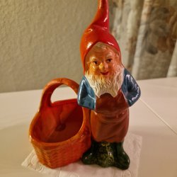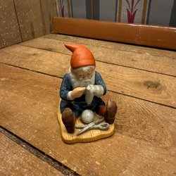 En söt tomte som passar bra som dekoration i hemmet. Den har en vit hatt och ett grått skägg.