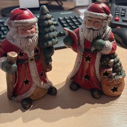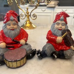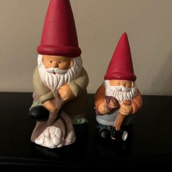 Två söta tomtar i keramik. Den ena sitter ner och håller en skål, den andra står upp och bär en bricka med mat.