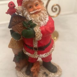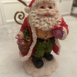 En jultomte figurin med en liten docka i handen. Runt tomten finns det presenter och en nallebjörn.