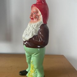 En söt trädgårdstomte med röd luva, grön jacka och grått skägg. Denna tomte är märkt med '97 undertill.
