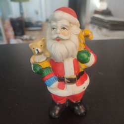 Tomtefigur i metallfärgen . Figuren är målad i rött, guld och silver. Den står på en oval bas. Höjd 34 cm