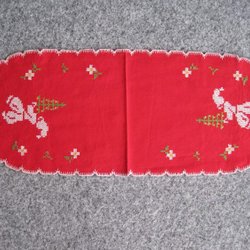 Broderat med rött moulinegarn på ljus bomullsväv fröskalVlieseline på baksidan