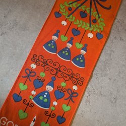 Charmig tryckt löpare i varma hösttoner – orange, gult, brunt och svart. Tryckt på juteväv med ett tätt blommönster i typisk scandinavisk retrostil. Design May Buhler. Mycket fint skick!