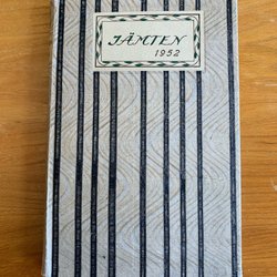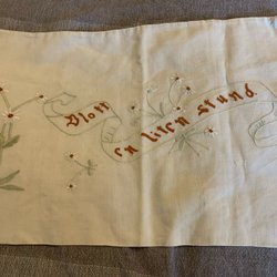 Vävd duk från Ekelund med ett motiv av två tomtar som står på ett hjärta.