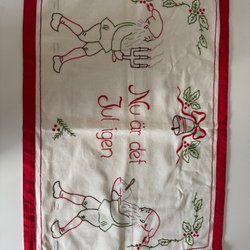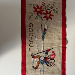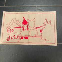 En julbonad i juteväv med broderat motiv av tomtar och texten ”God Jul”.