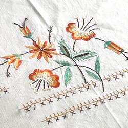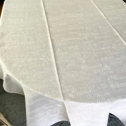 Längd 220 cm, bredd 117 cm, vikt 1,4 kg, broderat monogram, handfållad