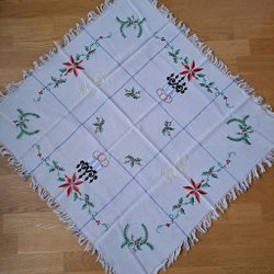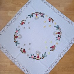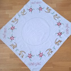 En julduk med broderi av julmotiv. Motivet består av grankvistar, ljus och texten "God Jul".