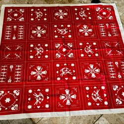 En söt julduk med klassiska julmotiv. Den har en röd kant och motiv med tomtar, ljus och en krans av julstjärnor. Texten ”God Jul” finns också tryckt på duken. Duken är bästa skick. 80x80 cm. Bomullstyg. Väldigt fin
