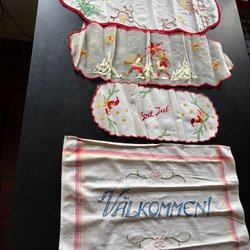 Diverse jultextilier med julmotiv. 80x30 40x15Diam, 20