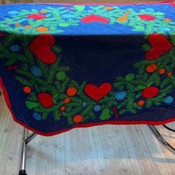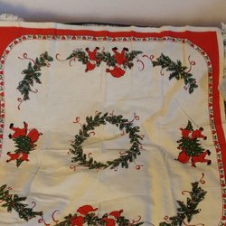 En gammal julduksduk med julmotiv. En liten fläck som säkert går att få bort. Men jag har inte försökt själv.