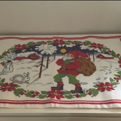 En fantastisk äldre välbroderad vepa med fint motiv och text ”Månen lyser på himlapäll, snön lyser vit i julekväll”. Troligen från 1940-talet, kantad med rött bomullsband, även baksidan är jättefin. Mycket fint skick, finns en lite mörkare fläck på himlen, se bild. Den syns mer på bild än i verkligheten. Zooma bilder för egen bedömning.