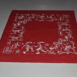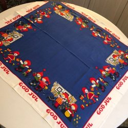 En söt julduk med ett tryckt motiv av tomtar och stjärnor. Perfekt för att skapa julstämning i hemmet. Den är tvättad och struken. Måtten är58x44. Kunden betalar frakten