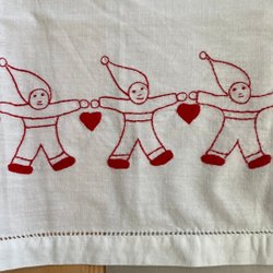 En julduk med broderade tomtar och hjärtan. Cirka 104 cm åt alla håll. Mycket fint skick.