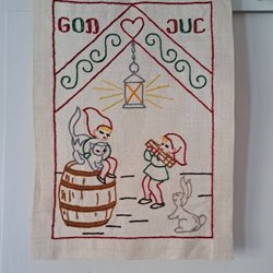 En julduk som jag tror är 50-tal. Roligt mönster med olika lussekatter. Stl 60x56 cm.