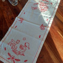 Äldre röda jultabletter/ dukar med handbroderade tomtar och stjärnor.