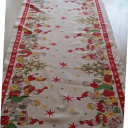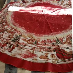 En julgransmatta med broderade detaljer av tomtar, fåglar och rött kantband.