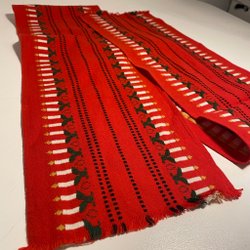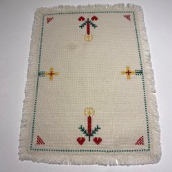 En julduk med rött broderi. Fin vit bordsduk med rött broderat motiv längs kanterna.