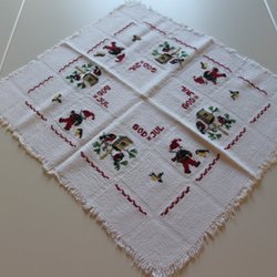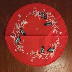 En festlig julduk med ett vackert tryck av fåglar, blommor och julmotiv. Perfekt för att skapa en härlig julstämning i hemmet.