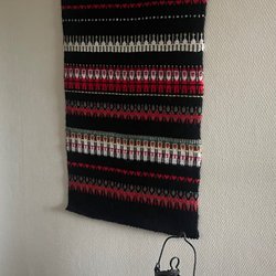En fin gammal väggbonad med ett vintermotiv. På bonaden syns en tomte med sin lykta och katt utanför ett hus i ett vinterlandskap. Texten "Månen vandrar sin tysta ban, snön lyser vit på fur och gran, snön lyser vit på taken, endast tomten är vaken" finns tryckt nedtill. Bonaden mäter 76 x 49cm och har trälist upp och nertill Köpare står för valfri frakt