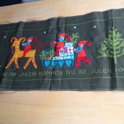 Äldre Julbonad med broderade tomtar och text. ”Var munter och glad vid dryck ock mad” Gammal handbroderad väggbonad till jul. Skick, se bilder. En liten lagning finns, se bild. Längd 135 cm bredd 41 cm.