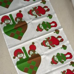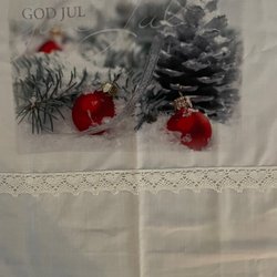 En charmig julgardin med broderade tomtar och röda rosetter. Perfekt för att skapa en mysig julstämning i hemmet. Mått 67 x 49. Kanal