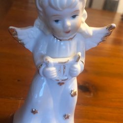 Dekorativ änglafigur, tillverkad av material som polysten eller gips.