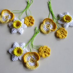 Tre stycken nyvirkade änglar i bomullsgarn, kanten virkad med guldtråd.