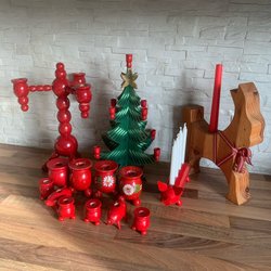 Diverse juldekorationer i trä. Inkluderar en tomte med röd luva, en gubbe med grått skägg, en släde med ved, en träljusstake i form av en gran 1900 tal och en blå ljusstake.