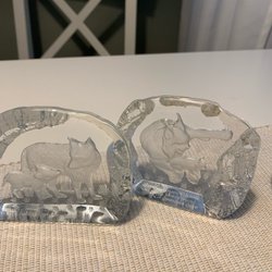 Två stycken julgrisar porslin grisen har texten ”God Jul” och texten ”Meeths Lyckogris”.vet ej ålder men mitten av 1900 talet.Meeth butik fanns i Göteborg 7 cm långa 4 cm höga ca