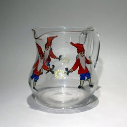 ETT SÅ FINT ANTIKT HANDBLÅST SNAPSGLAS MED EN TOMTE I EMALJFÄRG