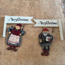 Ett set med tre julprydnader. Inkluderar en ljuslykta och två tomtar.