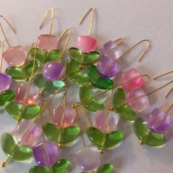 Små vita pärlemors skimmrande klockor med ett litet grönt löv. Tvinnad guldfärgad tråd.