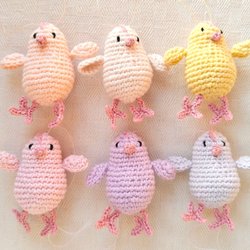 6 virkade harar i rosa, gult och lila bomullsgarn.