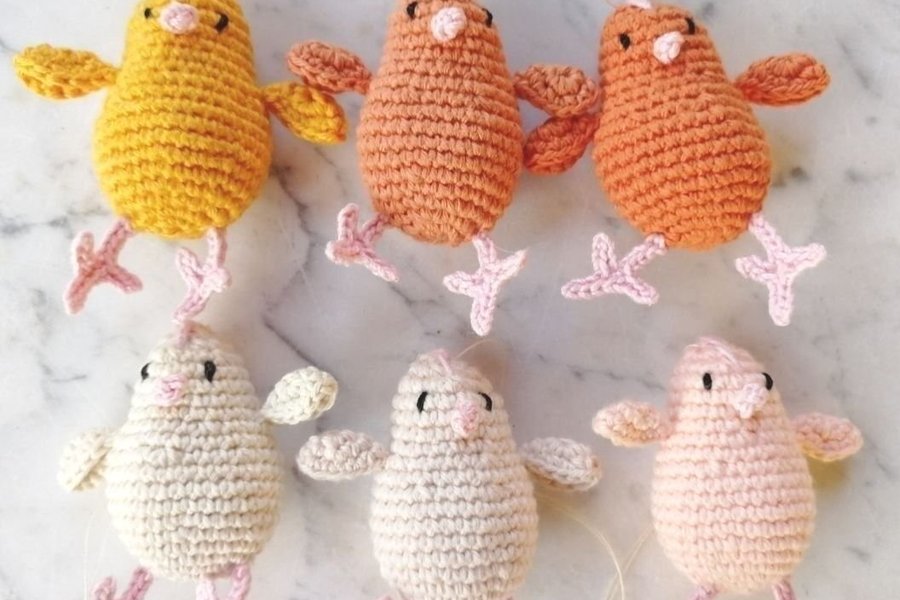 6 virkade kycklingar i gult, orange, oblekt och aprikost bomullsgarn.