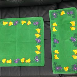 Två retro dukar med påskmotiv. Den ena är grön med ett mönster av blommor och kycklingarr, och den andra är beige med hönor och kycklingar.