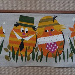 Retro påskbonad för väggupphängning, 60-70 tals med tryckt mönster av gula påskkycklingar, videkissar och blålila blommor mot en brun bakgrund.